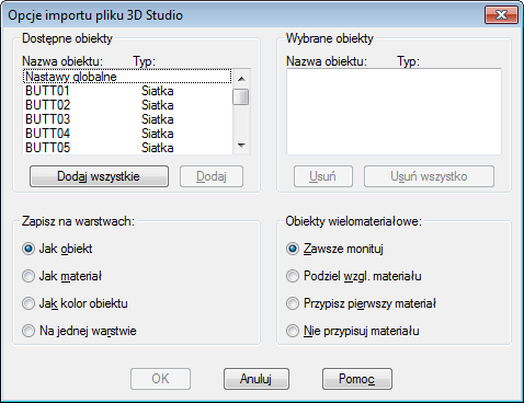 Wyświetla listę dostępnych i wybranych obiektów 3D, zapisuje obiekty 3D na warstwach i obsługuje obiekty, które używają wielu materiałów.