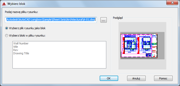 Używa wybranej definicji bloku z określonego pliku rysunku lub pliku szablonu rysunku.
