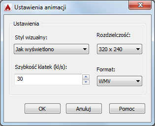Określa listę formatów wyjściowych animacji. Dostępne formaty to AVI, MPG, WMV i MOV.