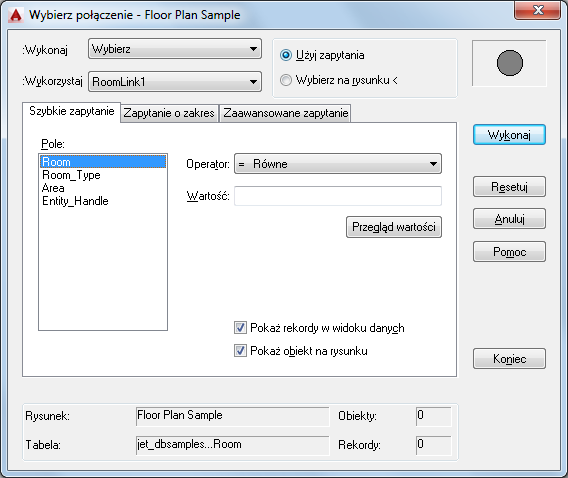 Wyświetla informacje o aktualnym stanie bieżącej operacji Wybierz połączenie. Wyświetlany jest bieżący rysunek i tabela, jak również liczba połączonych obiektów i rekordów, które aktualnie spełniają parametry określonego wyboru połączenia.