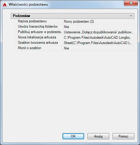 Określa plik szablonu rysunku (DWT) i nazwę układu, który zostanie użyty do tworzenia nowych plików rysunków dla tego podzestawu.