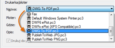 Z listy rozwijanej Drukarka/ploter wybierz opcję DWG na PDF.pc3: