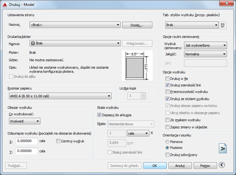 Dla wygody można zapisywać i przywracać kolekcje tych ustawień według nazwy. Te funkcje są nazywane konfiguracjami strony. Za pomocą konfiguracji strony można zapisać ustawienia, które będą potrzebne dla różnych drukarek, do drukowania w skali szarości, tworzenia pliku PDF z rysunku i tak dalej.