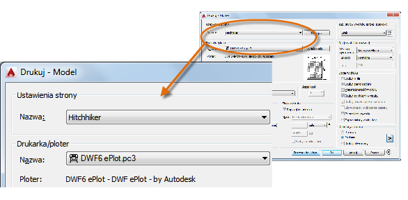 Aby rozpocząć drukowanie, wystarczy w oknie dialogowym Drukuj określić nazwę konfiguracji strony, a wszystkie ustawienia wydruku zostaną przywrócone. Na poniższej ilustracji w oknie dialogowym Drukuj określono użycie konfiguracji strony Hitchhiker, która spowoduje drukowanie do pliku DWF (Design Web Format) zamiast drukowania na ploterze.