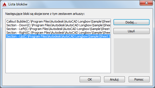 To okno dialogowe jest wyświetlane po kliknięciu przycisku Dodaj bloki w oknie dialogowym Kategoria widoku lub po kliknięciu przycisku [...] obok opcji Bloki objaśnień w oknie dialogowym Właściwości zestawu arkuszy.