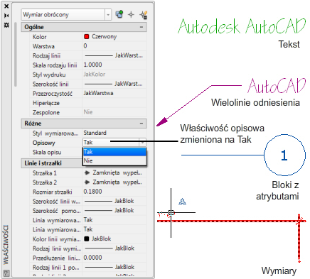 Do obiektów opisu należą wymiary, uwagi i innego typu symbole objaśniające bądź obiekty powszechnie używane do dodawania informacji do rysunku.