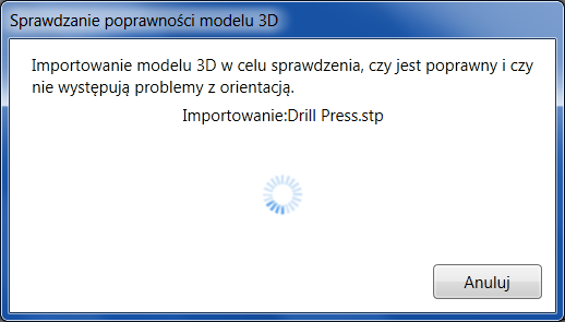 - Zostanie otwarte okno dialogowe Sprawdzanie poprawności modelu 3D, w którym, w trakcie importowania modelu 3D do układu, zostanie wyświetlony poniższy komunikat.