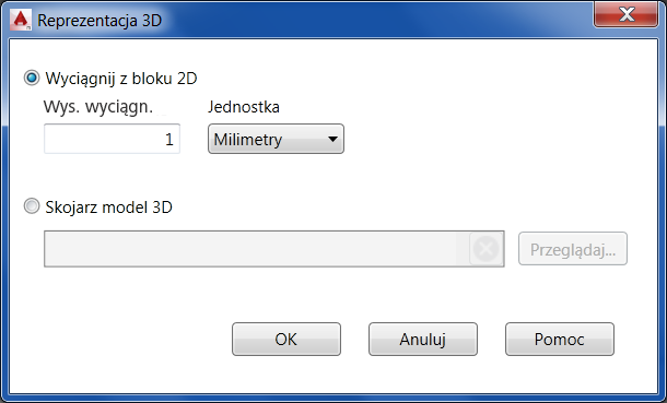 W tym temacie opisano dwie różne metody tworzenia reprezentacji 3D z zasobu bloku 2D. W przypadku obu procedur jest używane okno dialogowe Reprezentacja 3D. Po pomyślnym skojarzeniu modelu 3D z blokiem można go zaimportować i ustawić jego prawidłową orientację.