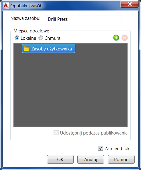 - Po określeniu domyślnego folderu Zasoby użytkownika lub utworzeniu nowego podfolderu zasobu należy ustalić, czy zasób ma być lokalny czy opublikowany w chmurze, wybierając przycisk opcji Lokalne lub Chmura.