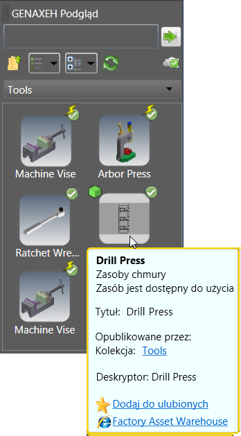 - Po opublikowaniu zasobu w chmurze można go pobrać w Przeglądarce zasobów. Dostęp do magazynu zasobów infrastruktury przemysłowej jest także możliwy za pośrednictwem przeglądarki zasobów z chmury.
