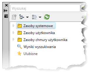 Przeglądarka zasobów zapewnia dostęp do Zasobów systemowych, Zasobów użytkownika, Zasobów z chmury i wyników wyszukiwania zasobów.