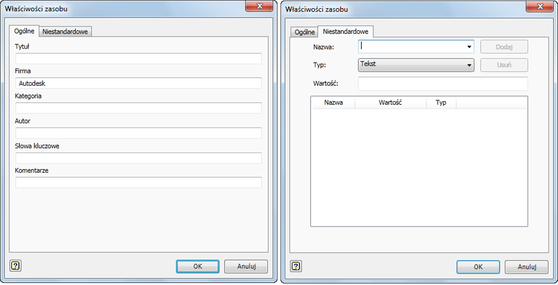 Karta Niestandardowe umożliwia dodawanie właściwości niestandardowych do wybranego zasobu. Właściwości niestandardowe umożliwiają klasyfikowanie zasobów factory i zarządzanie nimi, wyszukiwanie zasobów, tworzenie raportów oraz automatyczne aktualizowanie list części w rysunkach, a także zestawień materiałów w zespołach.
