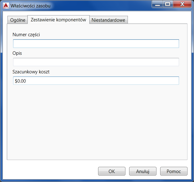- Karta Zestawienie komponentów zawiera pola: Numer części, Opis i Szacunkowy koszt. Mogą one być bardzo przydatne podczas przygotowywania zestawienia komponentów.