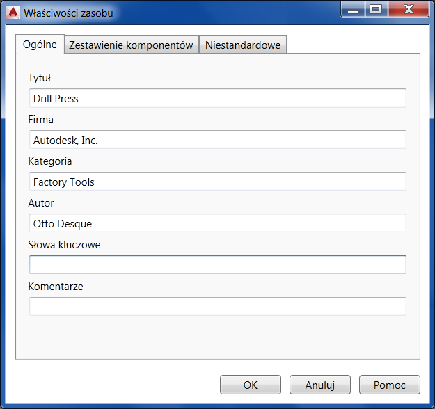 - Na karcie Ogólne można dodać właściwości w celu sklasyfikowania zasobu programu AutoCAD Factory i zarządzania nim. Wprowadź wymagane informacje w polach tekstowych. Są wśród nich pola: Tytuł, Użytkownik, Kategoria, Autor, Słowa kluczowe i Komentarze. Po zdefiniowaniu można wyszukać zasób na podstawie właściwości wprowadzonych w tych polach.