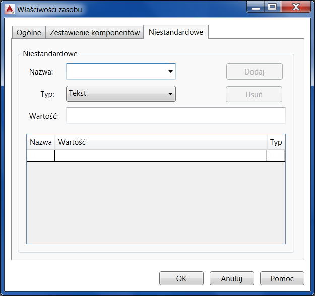 - Karta Niestandardowe pozwala dodać właściwości niestandardowe w celu sklasyfikowania zasobu, zarządzania nim i jego wyszukiwania. Pole Nazwa umożliwia określenie nazwy nowej właściwości niestandardowej lub wybranie istniejącej właściwości niestandardowej do edycji. Wpisz nazwę lub kliknij strzałkę i wybierz z listy rozwijanej. Pole Typ umożliwia określenie typu danych właściwości. Kliknij strzałkę i wybierz opcję z listy rozwijanej. Pole tekstowe Wartość umożliwia określenie wartości właściwości zasobu. Wartość musi być zgodna z wybranym typem danych. Na liście Właściwości są wyświetlane Nazwa, Wartość i Typ właściwości niestandardowych aktualnie zdefiniowanych w przypadku zasobu. Użyj przycisku Dodaj, aby dodać własną nazwę właściwości niestandardowej. Naciśnięcie przycisku Usuń powoduje usunięcie wybranej właściwości z listy Właściwości.