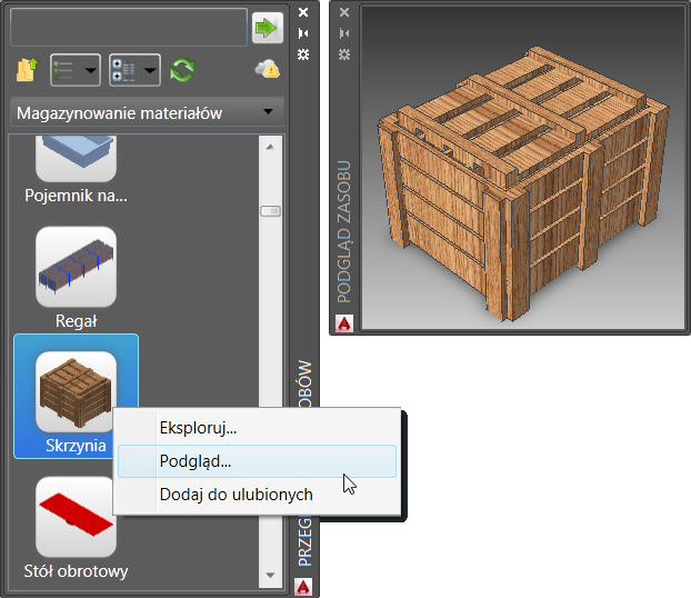 Uwaga: Zaleca się redagowanie zasobów 3D w programie Inventor Factory. Proces autoringu i publikowania uwzględnia opcję publikowania zasobu 2D, która pozwala na utworzenie i skojarzenie zasobu 2D z odpowiednim zasobem 3D. Po opublikowaniu za pomocą tej opcji zasób 2D jest wyświetlany w Przeglądarce zasobów programu AutoCAD Factory i można go umieścić.