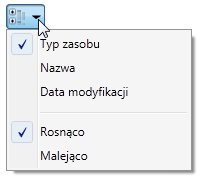 Wyszukiwanie zasobu można przyspieszyć przez posortowanie zasobów według typu, nazwy lub daty modyfikacji. Zasoby można również wyświetlać jako posortowane w porządku rosnącym (ustawienie domyślne) lub malejącym. Wybrana metoda sortowania jest trwała. Oznacza to, że jest zachowywana w kolejnych sesjach programu AutoCAD Factory. Kliknij strzałkę w dół na ikonie
