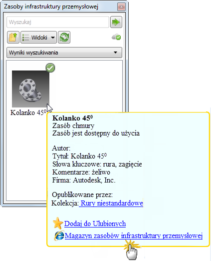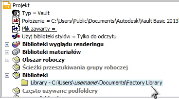Dowolne nowe zasoby Factory, które zostaną utworzone i opublikowane, można teraz dodawać bezpośrednio do folderu Biblioteka. Aby uzyskać więcej informacji o projektach programu Inventor, zobacz temat Informacje o projektach w Pomocy programu Inventor lub online na stronie wikihelp.autodesk.com/Inventor/plk/2014.