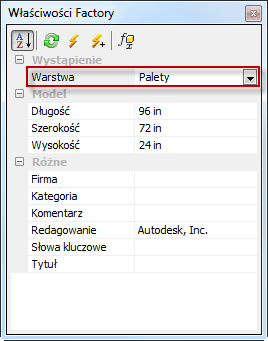 - Nazwa warstwy wybranego zasobu zostanie wyświetlona w górnej części przeglądarki Właściwości Factory. Jeśli zostały wybrane zasoby na różnych warstwach, jako nazwa warstwy pojawi się *WieleWartości*.