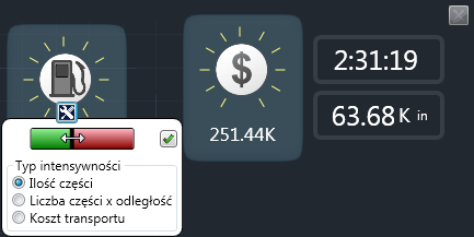 Można analizować koszty transportowania produktu, używając wielu zmiennych. Wynik pomoże w optymalizacji umieszczania zasobów Factory w układzie. Zmienne analizy można dostosować.