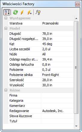 Przeglądarka Właściwości Factory jest wyświetlana domyślnie, ale można ją włączać i wyłączać.