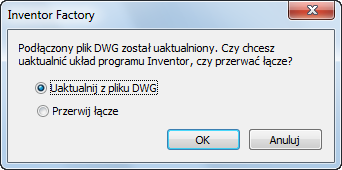 , aby wskazać powiązanie między układem programu AutoCAD 2D a nowo utworzonym układem 3D Factory. Użyj następującej procedury, aby zaktualizować układ 3D Factory po wprowadzeniu zmian do oryginalnego układu programu AutoCAD. Jeśli układ 2D jest otwarty w programie AutoCAD, to aby przeprowadzić aktualizację, należy go najpierw zamknąć.