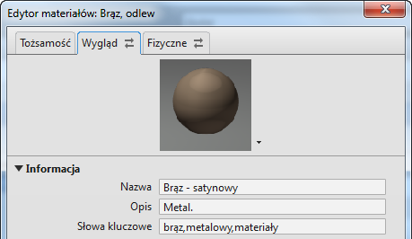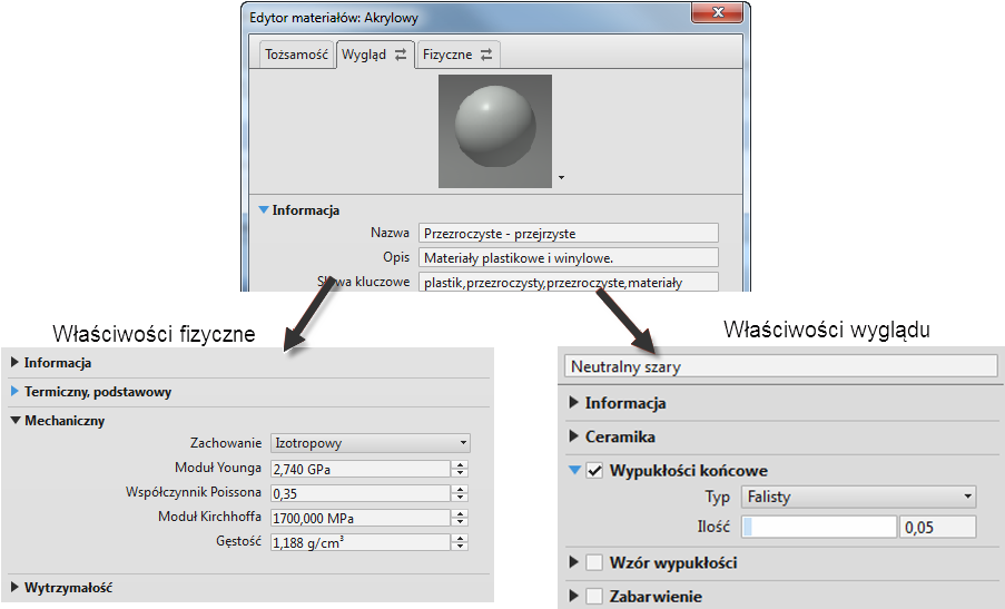 Do definicji materiałów przypisano wiele aspektów. Program Inventor używa dwóch: Wyglądu i Fizyczne. Każdy z nich ma określone właściwości należące do definicji materiału.