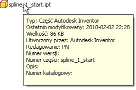 Po zatrzymaniu kursora na nazwie pliku programu Inventor zostanie wyświetlona podpowiedź z właściwościami tego pliku.