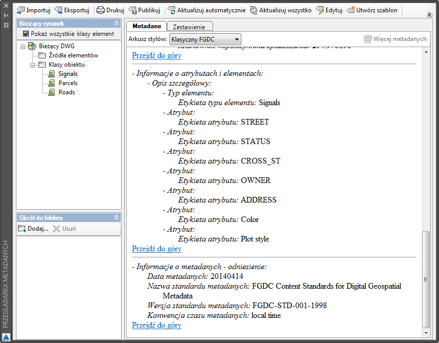 Jeśli rysunek zawiera sklasyfikowane obiekty, jego metadane są automatycznie generowane i wyświetlane po pierwszym otwarciu przeglądarki metadanych.