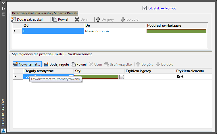 Kliknięcie przycisku Nowy temat umożliwia zdefiniowanie tematu dla warstwy Działki.