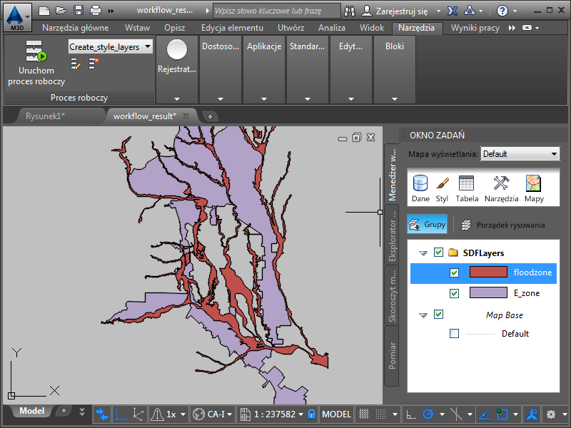Po uruchomieniu procesu roboczego program AutoCAD Map 3D wyświetla listę plików SDF w określonym folderze. Następnie tworzy grupę Menedżera wyświetlania przeznaczoną do przechowywania tworzonych warstw. Program łączy się z plikami SDF znajdującymi się w określonym folderze. W przypadku każdego rysunku znajdującego się w określonym folderze łączy się z nim, dodaje warstwę do Menedżera wyświetlania i przenosi warstwy do nowej grupy.