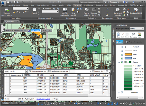 Ta mapa zawiera warstwy Menedżera wyświetlania opisujące tory kolejowe, drogi, parki, rzekę i działki. Każda warstwa ma przypisany inny styl. Wstępne omówienie elementów okna aplikacji AutoCAD Map 3D zawiera Lekcja 2: Krótki przegląd aplikacji AutoCAD Map 3D.