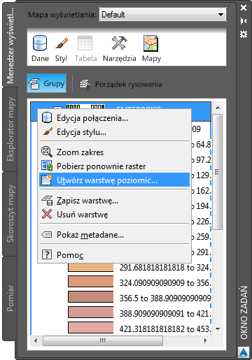 Kliknięcie warstwy powierzchni prawym przyciskiem myszy w Menedżerze wyświetlania umożliwia utworzenie warstwic.