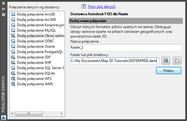 - W oknie Połączenie danych z listy Połączenia danych wg dostawcy wybierz opcję Dodaj połączenie obrazu rastrowego lub powierzchni i kliknij przycisk