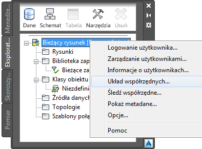 - Prawym przyciskiem myszy kliknij pozycję Bieżący rysunek, a następnie kliknij opcję Układ współrzędnych.
