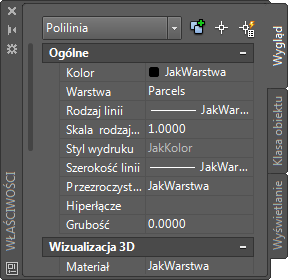 Paleta Właściwości umożliwia wyświetlanie właściwości wybranego obiektu rysunkowego lub elementu.