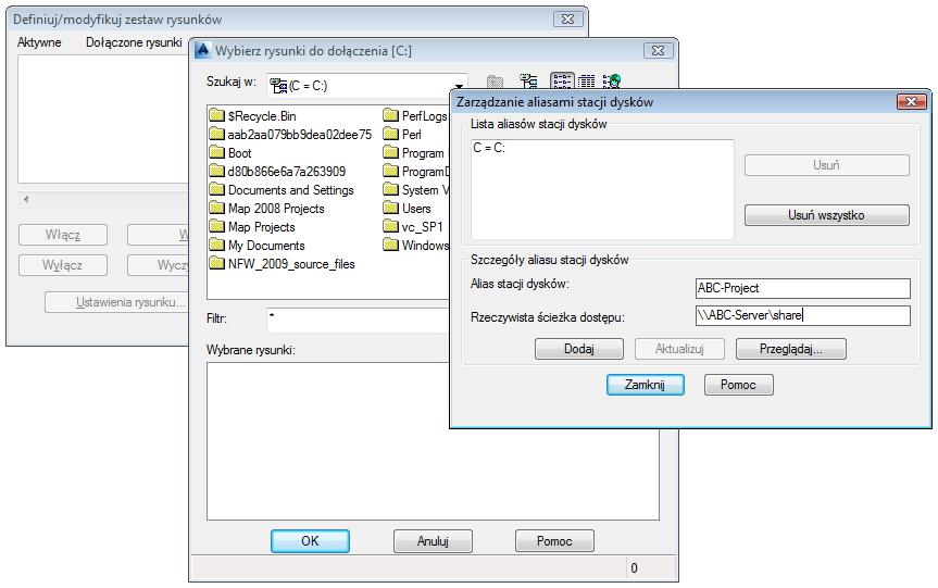 Po wykonaniu tych czynności położenie przedstawione na rysunku zostanie odwzorowane na alias napędu. Następnie możliwe będzie otwieranie rysunków z tego folderu bez dalszego definiowania aliasów.