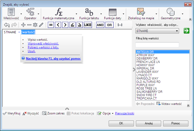 Lista właściwości jest zapełniana po kliknięciu zielonej strzałki. Wybierz i ustaw wartości.