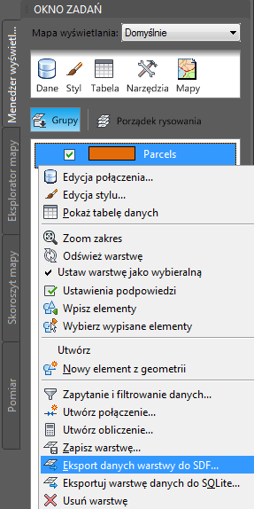 - W Menedżerze wyświetlania kliknij prawym przyciskiem warstwę Działki i wybierz Eksportuj dane warstwy do pliku SDF.