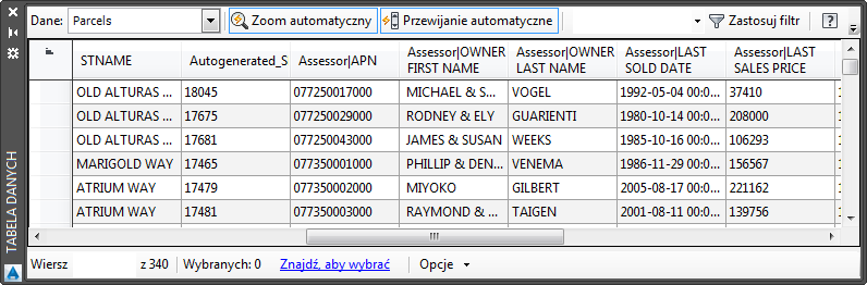 W warstwie Działki są teraz wyświetlone dane aktualne. Jednak dane połączone w Tabeli danych są szare. Szary tekst odzwierciedla fakt, że dane połączone nie stanowią części oryginalnej składnicy danych. Nie można ich edytować ani używać we właściwości obliczonej.