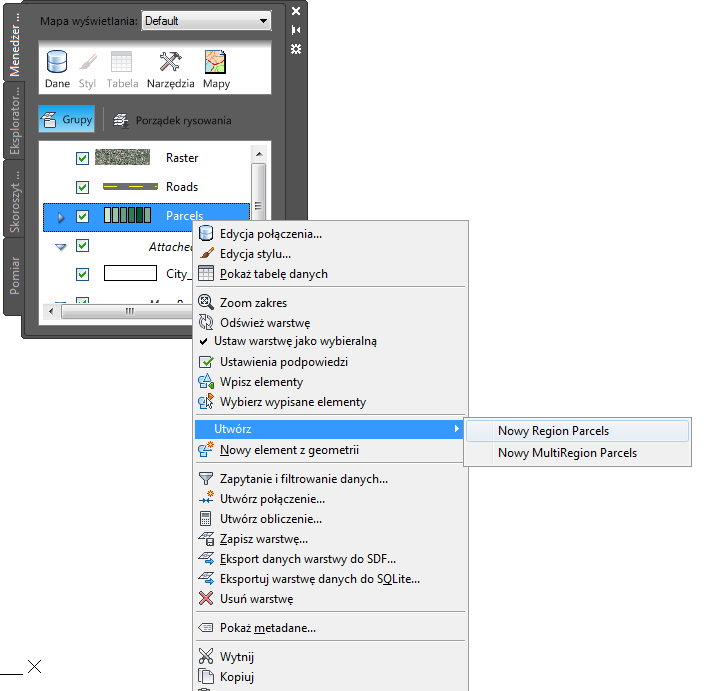 Wszystkie elementy w programie AutoCAD Map 3D mają niestandardowe menu zawierające polecenia właściwe danemu elementowi w danej chwili.