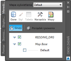 Karta Menedżer wyświetlania w oknie zadań umożliwia określanie stylu i sposobu wyświetlania elementów na mapie. Warstwy w Menedżerze wyświetlania są inne niż warstwy AutoCAD, ale umożliwiają wykonywanie podobnych czynności. Na przykład: można ukryć i wyświetlić warstwy Menedżera wyświetlania, nawet jeśli te warstwy zawierają obrazy rastrowe inne niż obiekty rysunkowe.