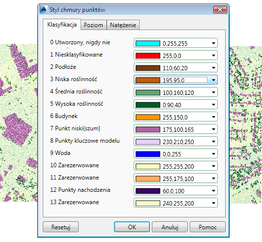 można określać style według klasyfikacji, poziomu, intensywności LiDAR i wartości RGB.