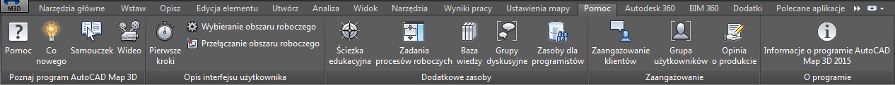 - Pomoc: Przeglądaj lub wyszukaj pojęcia i procedury, które obejmują wszystkie funkcje programu AutoCAD Map 3D.