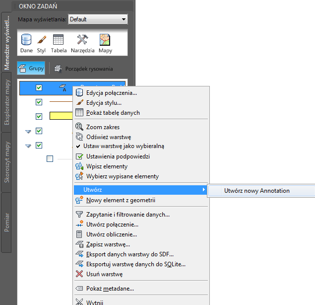 Każdy opis jest jednym „wystąpieniem tekstu”. Do warstwy tekstu można dodać wiele wystąpień tekstu. Po późniejszym uzyskaniu połączenia z warstwą tekstu wszystkie wystąpienia tekstu zostaną wstawione na mapie.