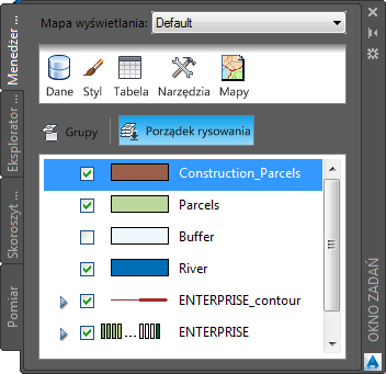 Na karcie Menedżer wyświetlania nowa warstwa ma nazwę Działki.