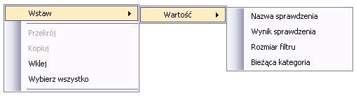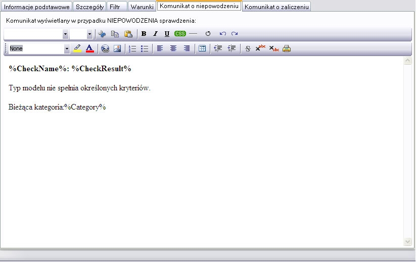 W górnej części znajduje się standardowy edytor HTML typu WYSIWYG. Poniżej w treści można wprowadzić tekst, obrazy, hiperłącza, tabele i dane szczegółowe w celu identyfikacji przyczyn prowadzących do niepowodzenia sprawdzenia. Obszary ze znakiem % to tekst dynamiczny. W wypadku użycia zostanie zastąpiony rzeczywistymi wartościami sprawdzania w przeglądarce wyników. Tekst dynamiczny można dodać, klikając prawym przyciskiem myszy treść i wybierając z menu wysuwanego opcję Wstaw: