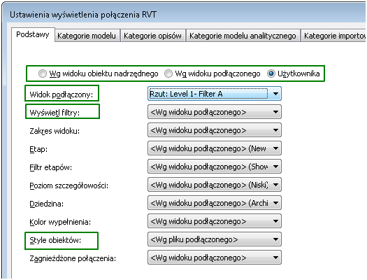 Aby sterować wykorzystaniem filtrów w przypadku modeli podłączonych w widoku obiektu nadrzędnego, użyj ustawień dostępnych w oknie dialogowym Ustawienia wyświetlania połączenia RVT.