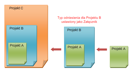 Jeśli zmienione zostanie ustawienie Typ odniesienia dla projektu A (w modelu nadrzędnym, w projekcie B) na Dołączenie, to podczas importu projektu B do projektu C zostanie wyświetlone zagnieżdżone połączenie (projekt A).