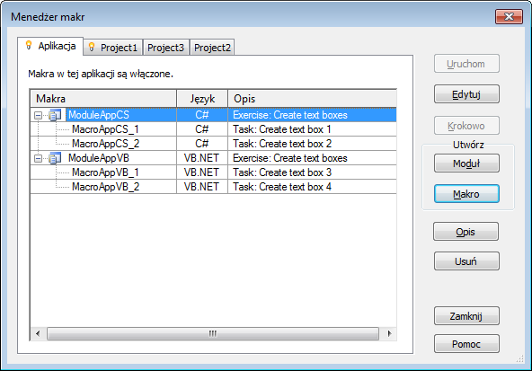Menedżer makr służy do zarządzania makrami i uruchamiania ich.